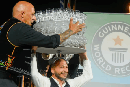 Edellinen ennätys oli 319 lasia, mutta Dinos pyyhkäisi sen ohi mennen tullen. Kun viimeinenkin tarjotin oli paikoillaan, Dinos tanssi perinteisen lasitanssin ja piti koko komeuden tasapainossa vähintään 10 sekuntia – siinä ajassa moni meistä kaataisi jo yhdenkin lasin. Paikalla olleet Guinnessin viralliset tuomarit varmistivat suorituksen ja video tallensi jokaisen sydämentykytyksen. Lopullinen lukema on vielä Guinnessin vahvistusta vaille, mutta kylällä tätä juhlitaan jo varmana voittona.