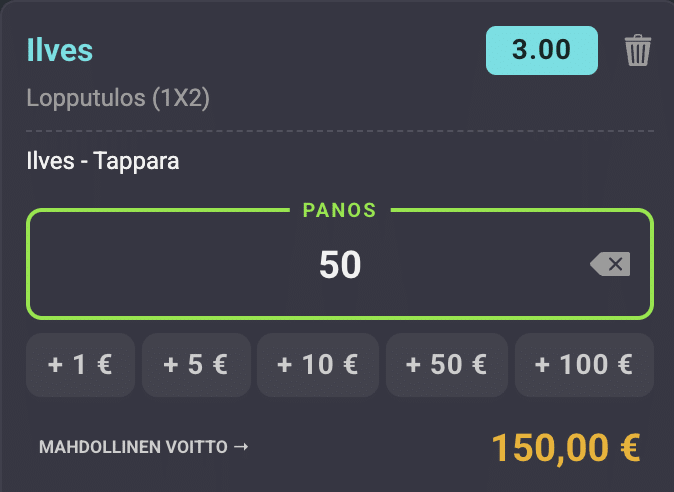 Kymppi Ilveksen voitolle tuo 15O euroa