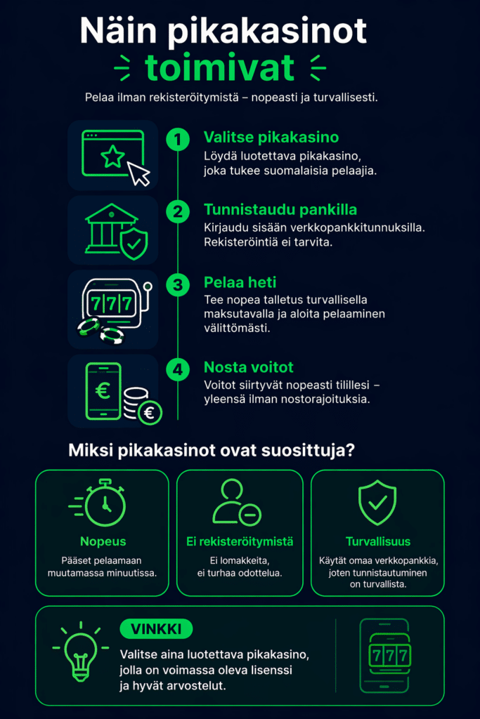 Pikakasinot ovat suomalaisille pelaajille nopea ja helppo tapa aloittaa pelaaminen ilman perinteistä rekisteröitymistä. Tunnistautuminen tapahtuu yleensä verkkopankkitunnuksilla talletuksen yhteydessä, minkä ansiosta pelaaminen alkaa nopeasti ja myös kotiutukset voidaan parhaimmillaan käsitellä minuuteissa.